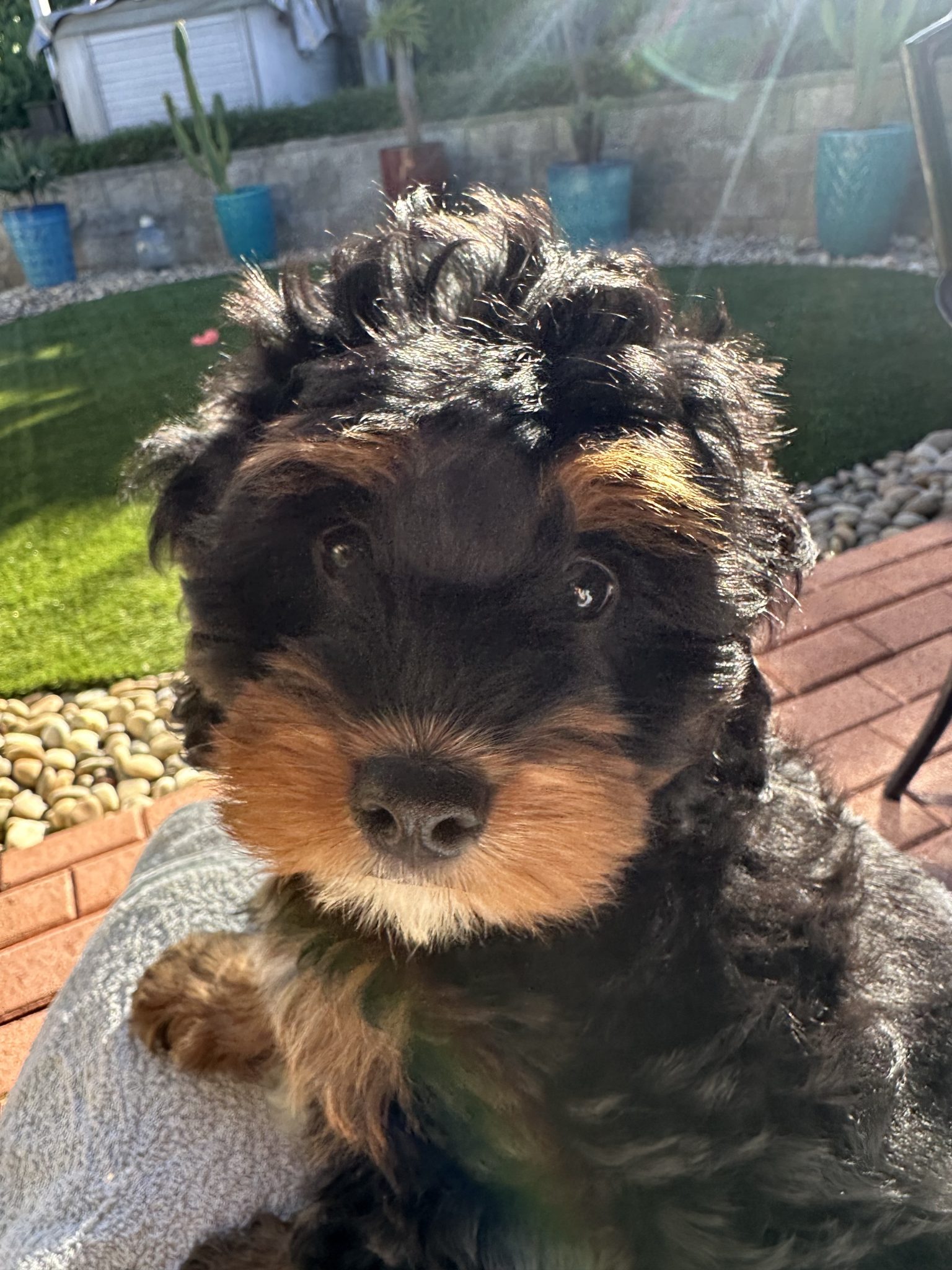 Kota is the sweetest Mini Bernedoodle! We have had her 1 1/2 weeks today. She is crate trained and sleeps from 11PM to 5:30AM! We feed her in the morning and around 5PM in the evening. We have taken her in a little backpack to an Art Show in La Jolla and today to Costco. She loves riding in the car! We give her a treat every time she goes potty in the backyard and she is learning quickly! We are so happy with her!