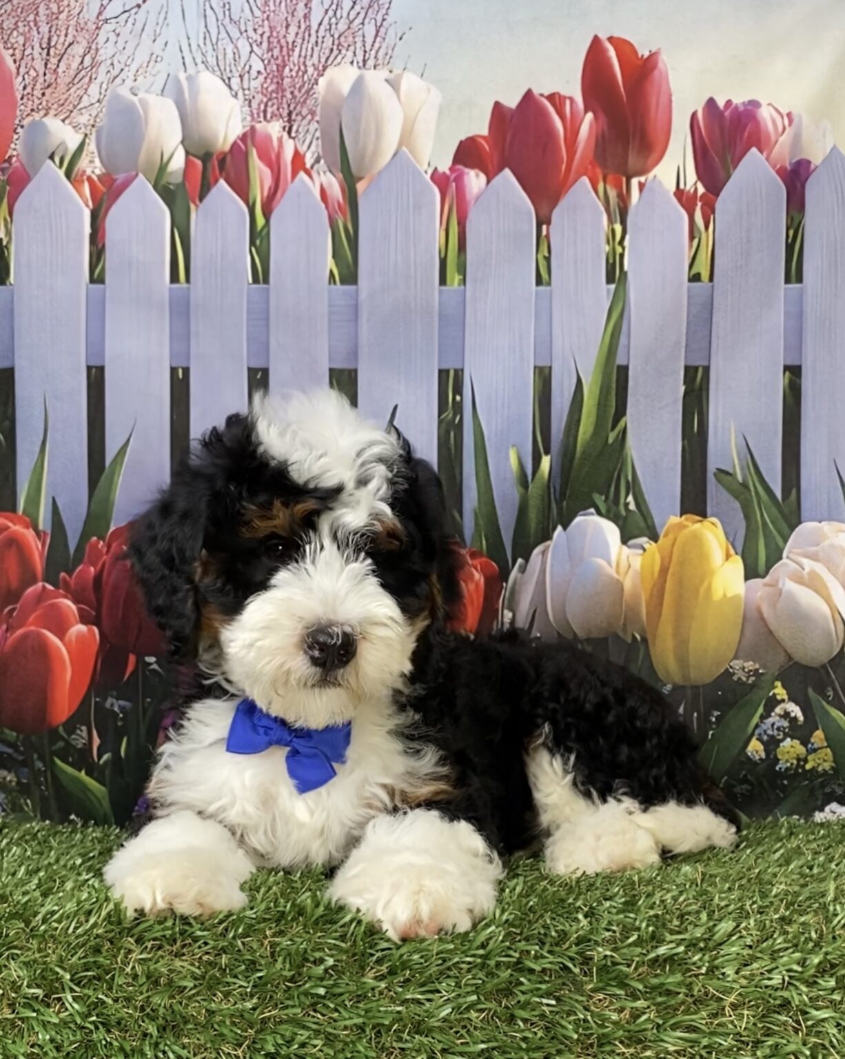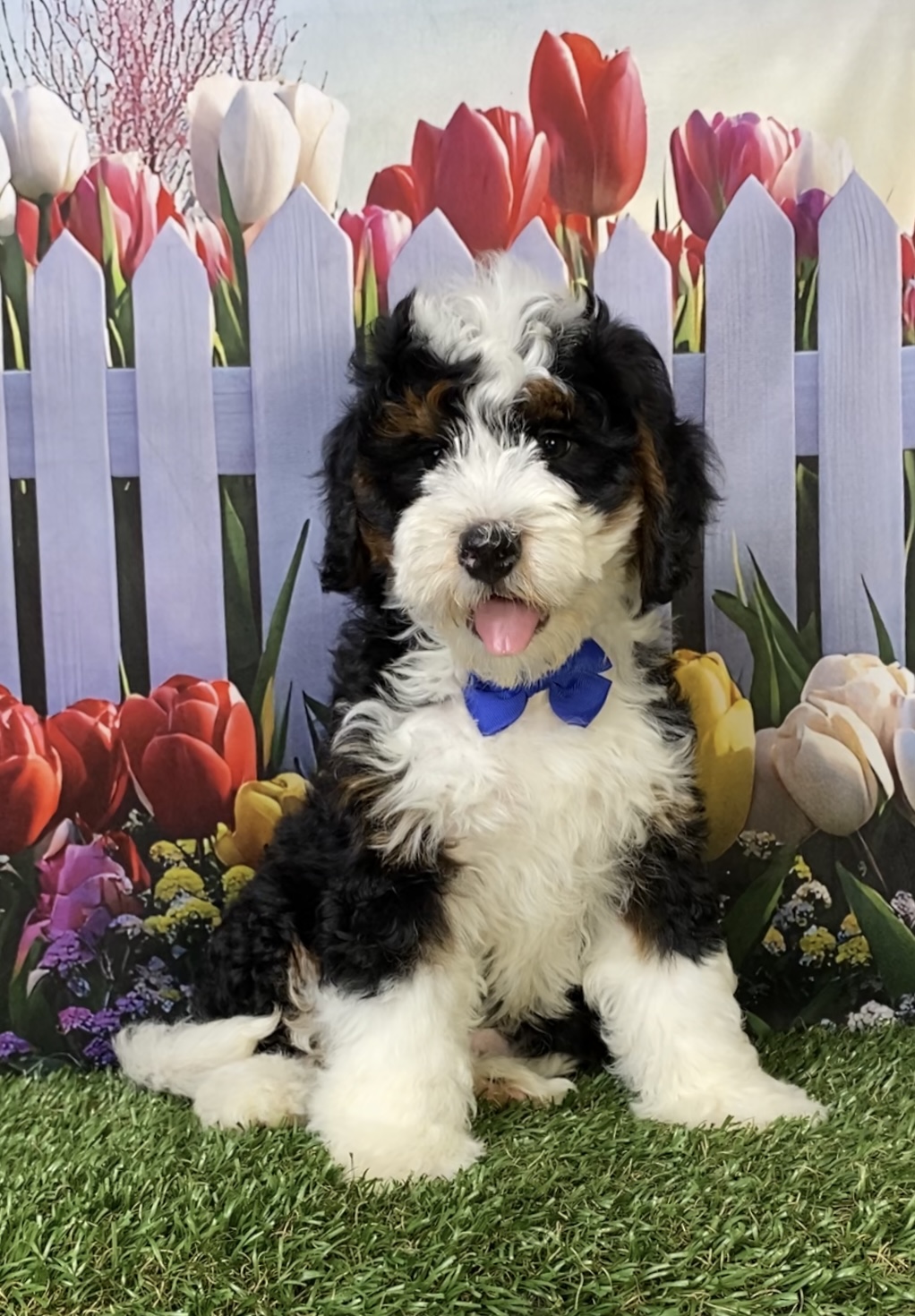 Meet this adorable Mini-Bernedoodle, a tiny bundle of joy with a delightful personality and a coat as soft as a cloud. Blending the intelligence and hypoallergenic traits of a Poodle with the friendly nature and stunning colors of a Bernese Mountain Dog, this pup is the perfect companion for any household. Mr. Kyle promises endless love and happiness to those lucky enough to bring him home.