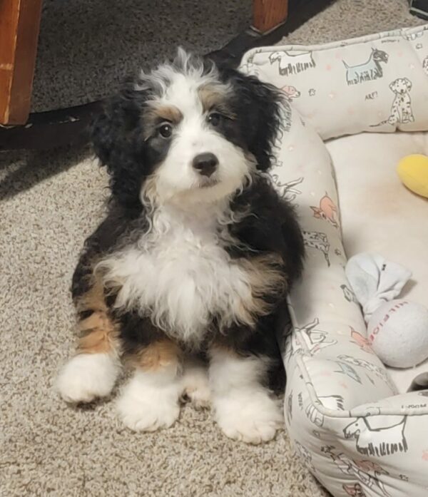 Meet this adorable Mini-Bernedoodle, a tiny bundle of joy with a delightful personality and a coat as soft as a cloud. Blending the intelligence and hypoallergenic traits of a Poodle with the friendly nature and stunning colors of a Bernese Mountain Dog, this pup is the perfect companion for any household. Ms. Twila promises endless love and happiness to those lucky enough to bring him home.