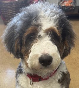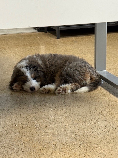 Our work team experienced a very sad situation with our previous pup. While the office area was mostly quiet, our owner went on a search for a furry friend to bring life back into our office. After days of searching, I came across your website and located Oscar (named at the time). His eyes are what sold him to us, plus the fact that he was going to be small to medium. He was purchased and delivered to us as promised. Boy has this guy been a joy to us; you always have to expect the unexpected. He is full of joy, love, and happiness. It’s unbelievable how special this puppy was to us. Now, 8 months later, we have a 65 lbs full-grown dog that is like a bull in a china cabinet. He has so much personality, and of course, his eyes still melt us all. Thank you for what was supposed to be a Mini Bernedoodle, for having a wonderful / wouldn’t change him for the world monster.