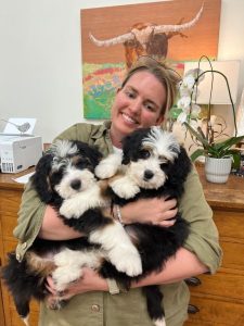She is such a doll….we love her so much!!! She is the best puppy. Sleeps a solid 11 hours with no whimpers and no accidents. She loves seeing her brother every day at work. My daughter Stephanie has Iverson (now Mah na Mah na from the muppets song 😂) and we work together. They bring us so much joy! Steph with both pups at our art studio.